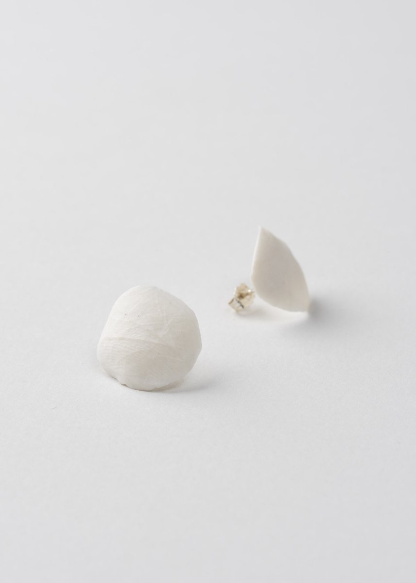 Små, tunna örhängen av porslin med stift och snurrebuss i 925 sterling silver. Vart och ett av dessa örhängen har sin unika kombination av form och präglat mönster och varje par är matchat för att vara lika men inte identiska. Diskreta men personliga vardagsörhängen som passar till det mesta. Genom sin nätta storlek sitter de tryggt på örsnibben och tål normal hantering. Material: 925 sterling silver, porslin. Storlek: Ca 0,6-1 cm Pris per par.
